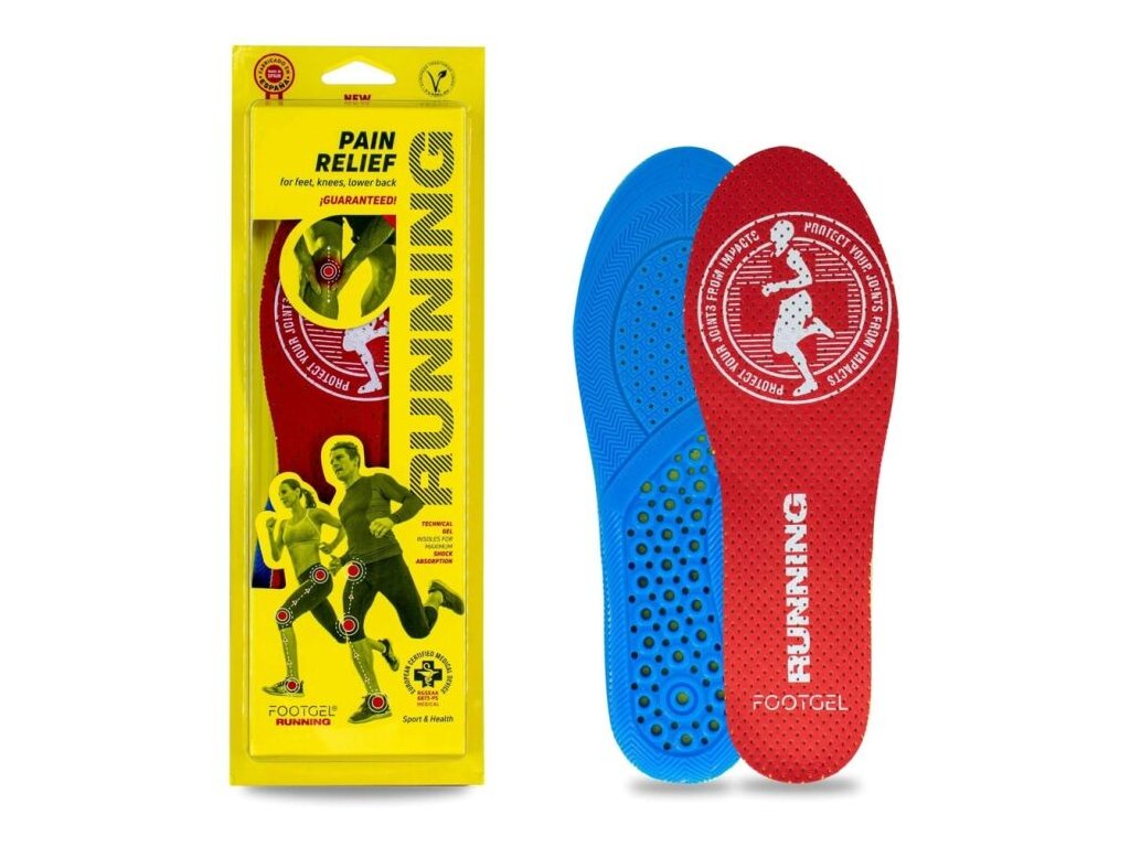 Gelové vložky Footgel RUNNING jsou díky vysoké absorpci nárazů a ochraně doporučovány speciálně pro běžce. Trojvrstvé gelové vložky zlepšují sportovní výkon a zvyšují ochranu před zraněním. První vrstva vám zajistí pohodlí, protože je z rychleschnoucí technické tkaniny, která má antibakteriální, antialergenní a termoregulační vlastnosti. Druhá vrstva je z prodyšné technické pěny s aktivním uhlím a slouží k eliminaci vlhkosti a zápachu. Třetí vrstva je z gelu, který absorbuje nárazy při dopadu a odrazu a chrání tak nárt, patu, koleno a kyčle. Perforace usnadňuje proudění vzduchu pro udržení suchých nohou. absorbuje nárazy eliminuje zápach eukalyptová vůně šetrné k životnímu prostředí